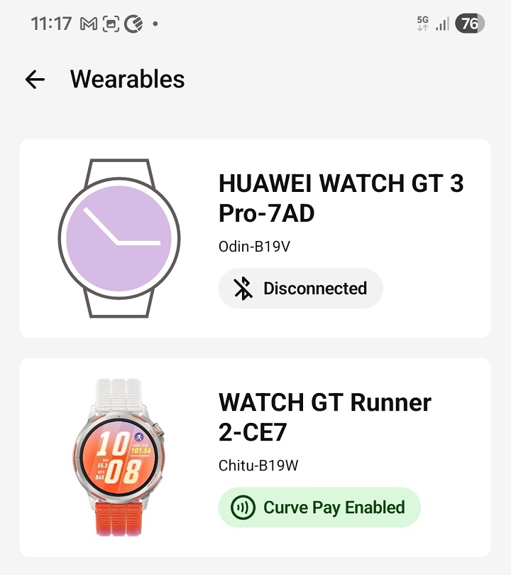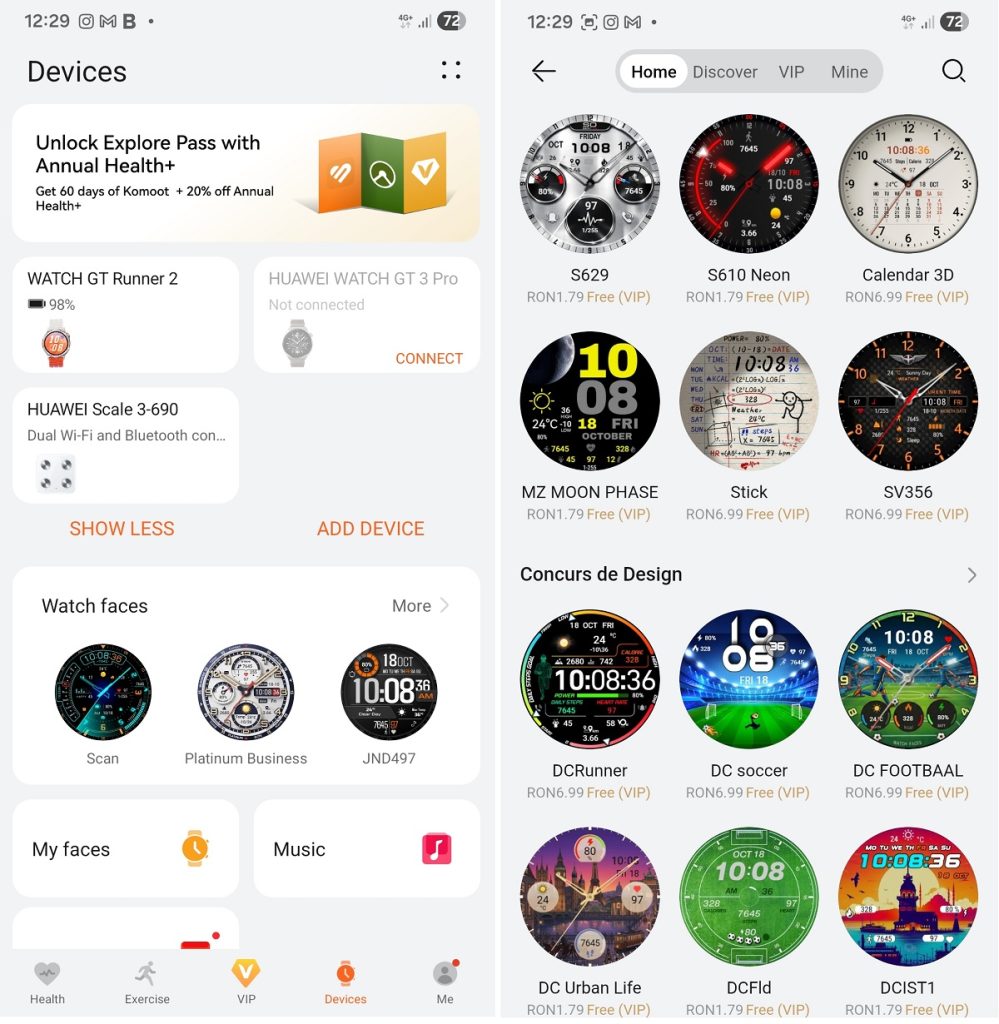 Ca o scurtă paranteză, un mare bravo pentru Huawei, pentru felul în care se poate face switch între cele două ceasuri prezente în aplicație. Îmi place mult că sunt centralizate măsurătorile de pe cele două. Dacă port Runner-ul la alergare, dar după, când plec la birou, iau GT 3 Pro-ul, în zona de puls cardiac spre exemplu, se văd măsurătorile de la ambele ceasuri. Fain!