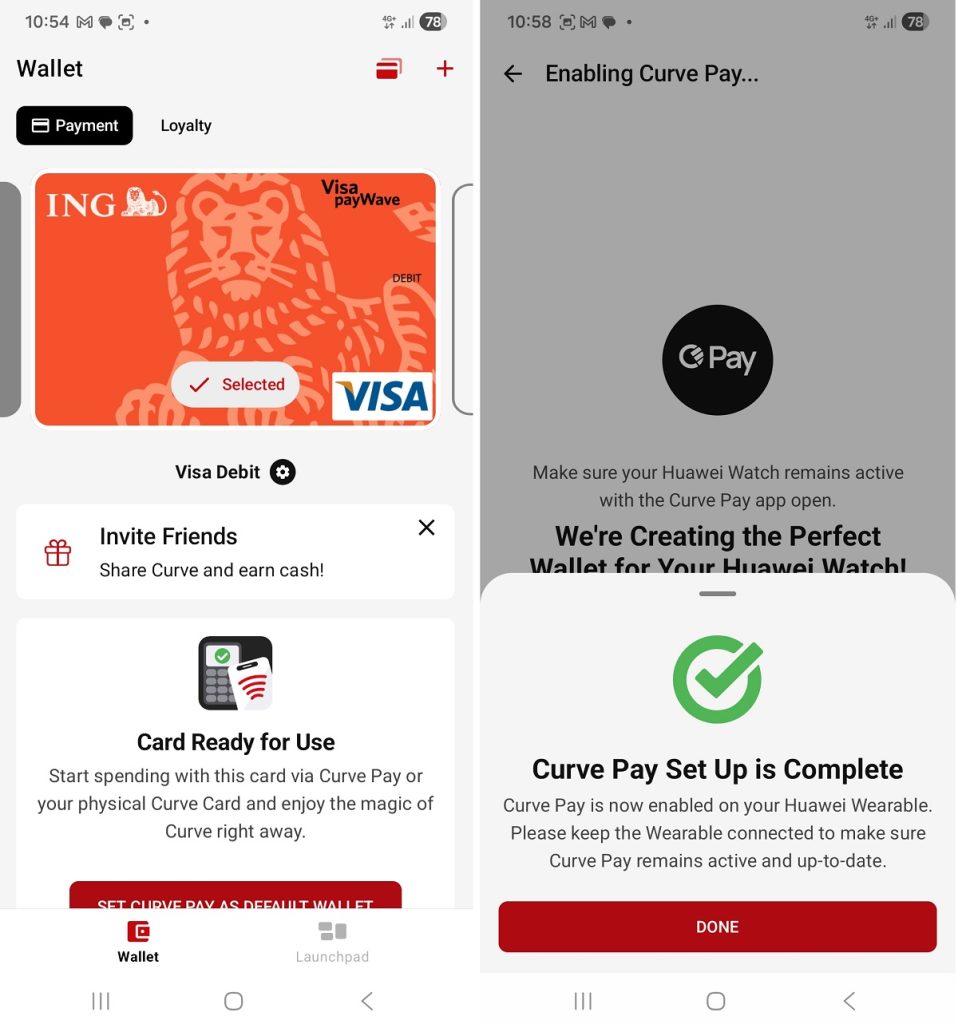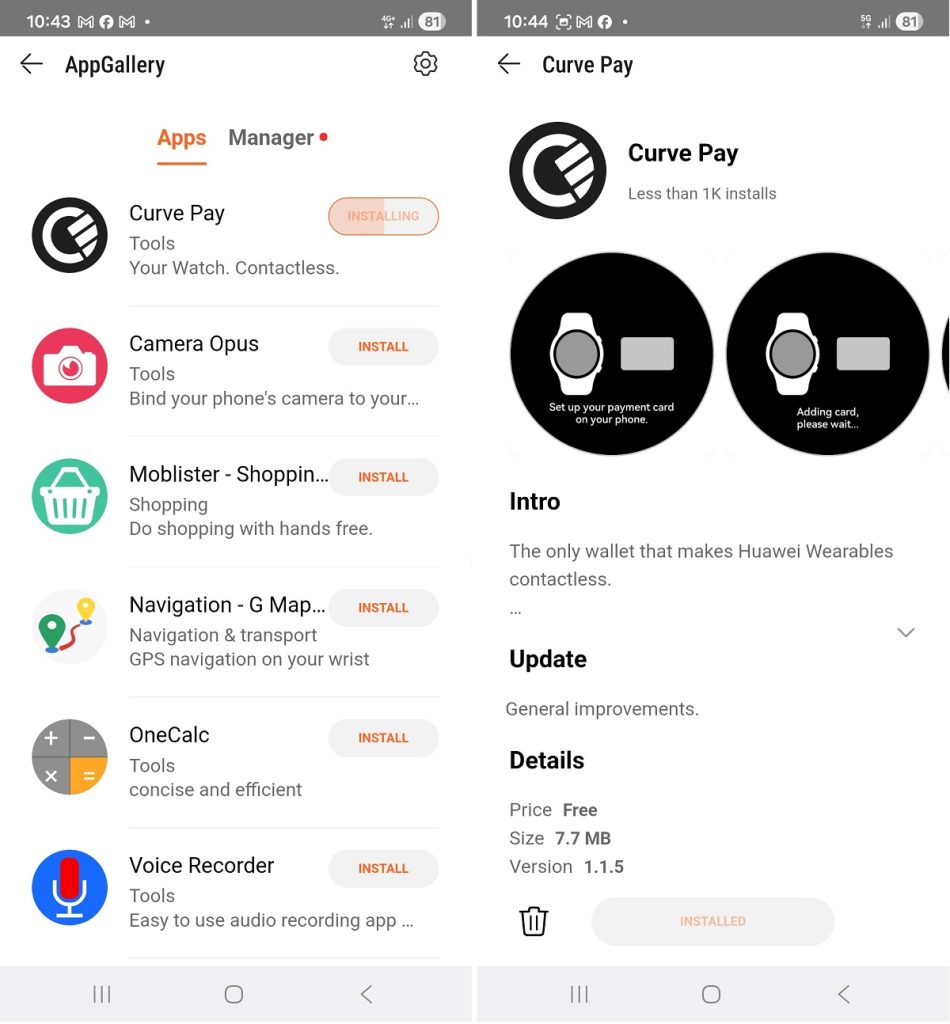 Aplicația Curve Pay trebuie instalată atât pe telefon (din Google Play), cât și pe ceas (din App Gallery, via Huawei Health). Pe telefon se face și înrolarea cardului bancar (pot fi și mai multe), iar la final în aplicația Curve Pay de pe telefon, se selectează dispozitivul wearable cu care se vor executa plățile. Am zis-o, pare mai stufos, dar este suficient de intuitiv.