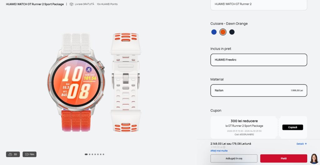 Desigur, atunci când parcurgi lista cu specificații tehnice și funcționalități pentru un astfel de produs, prima întrebare care se ridică automat este cea legată de prețul de vânzare. Huawei Watch GT Runner 2 are un preț de 2149 lei pe site-ul oficial al companiei. Cu o reducere promoțională de 300 de lei, așa cum se poate vedea. Mai jos aveți și o captură de ecran, pentru eventualitatea în care aceste prețuri variază.