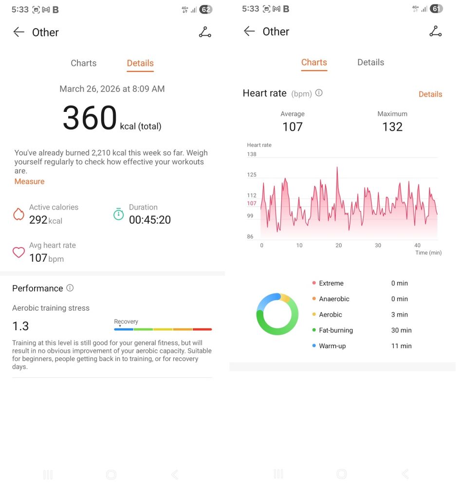 Pe monitorizarea unui workout clasic, raportarea finală este ceva mai sumară. Dar este urmărit și acolo pulsul cardiac. Mai sus aveți cele două capturi de ecran din aplicație.